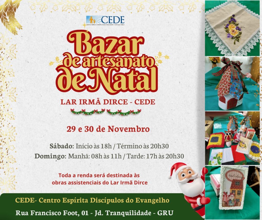 BAZAR DE ARTESANATO DE NATAL – LAR IRMÃ DIRCE NO CEDEEstá chegando o dia!!!E terão todos os tipos de artigos: crochê, panos de pratos, caminho de mesa e uma grande variedade de artesanato! Venham conferir! ✨Não percam!🗓️ 29/11 (sábado) das 18h00 às 20h30🗓️ 30/11 (domingo) das 08h00 às 11h00 e 17h00 às 20h30📍 Local: CEDE – Rua Francisco Foot, 01 – Jd. Tranquilidade